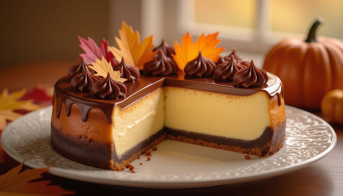 A photorealistic image of a Thanksgiving chocolate cheesecake, richly decorated with warm, inviting colors. The art style blends expressive brushwork with ethereal, detailed elements, illuminated by soft lighting.