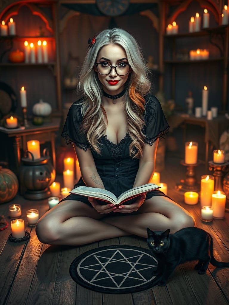 A striking image of an albino sorceress with gothic makeup and black/orange hair highlights, seated cross-legged in a magical fantasy room filled with candles and Halloween decor.