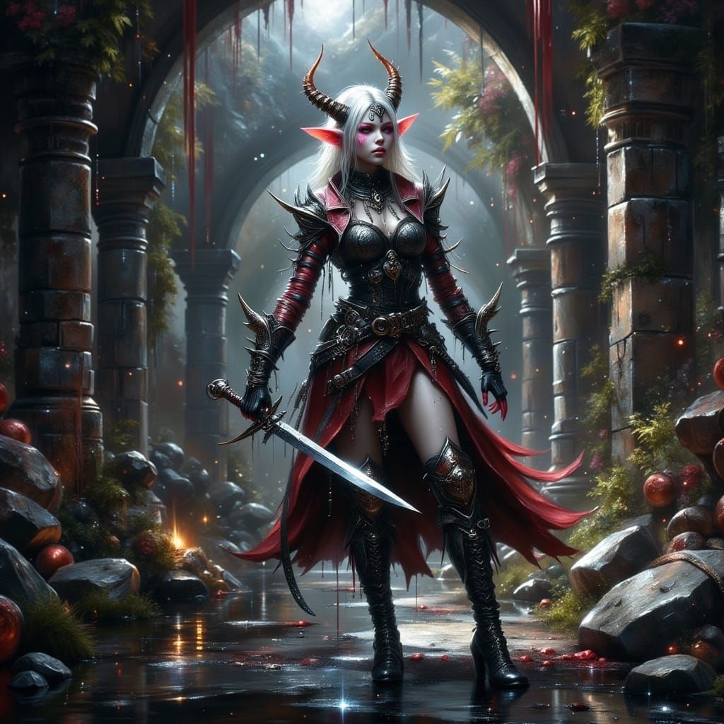 A striking picture of a drow elf with white hair and pink eyes in a forgotten city. The art style is reminiscent of dystopian digital matte paintings with maximalist details and cinematic lighting.
