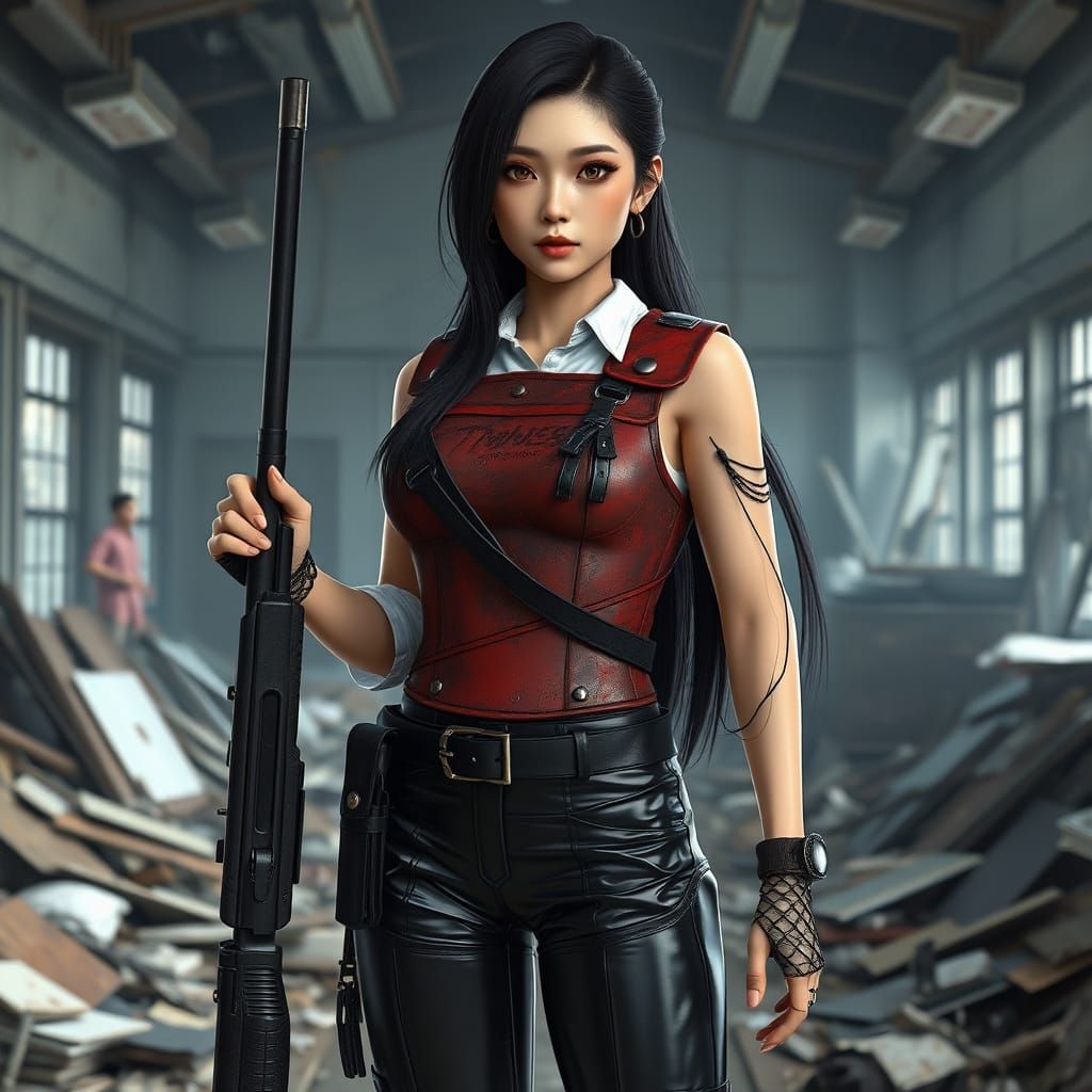 This striking image of a confident Chinese woman in armor stands amidst office ruins, clutching a shotgun. Her 3D anime art style, reminiscent of Genshin Impact, features intricate details and a captivating aesthetic.