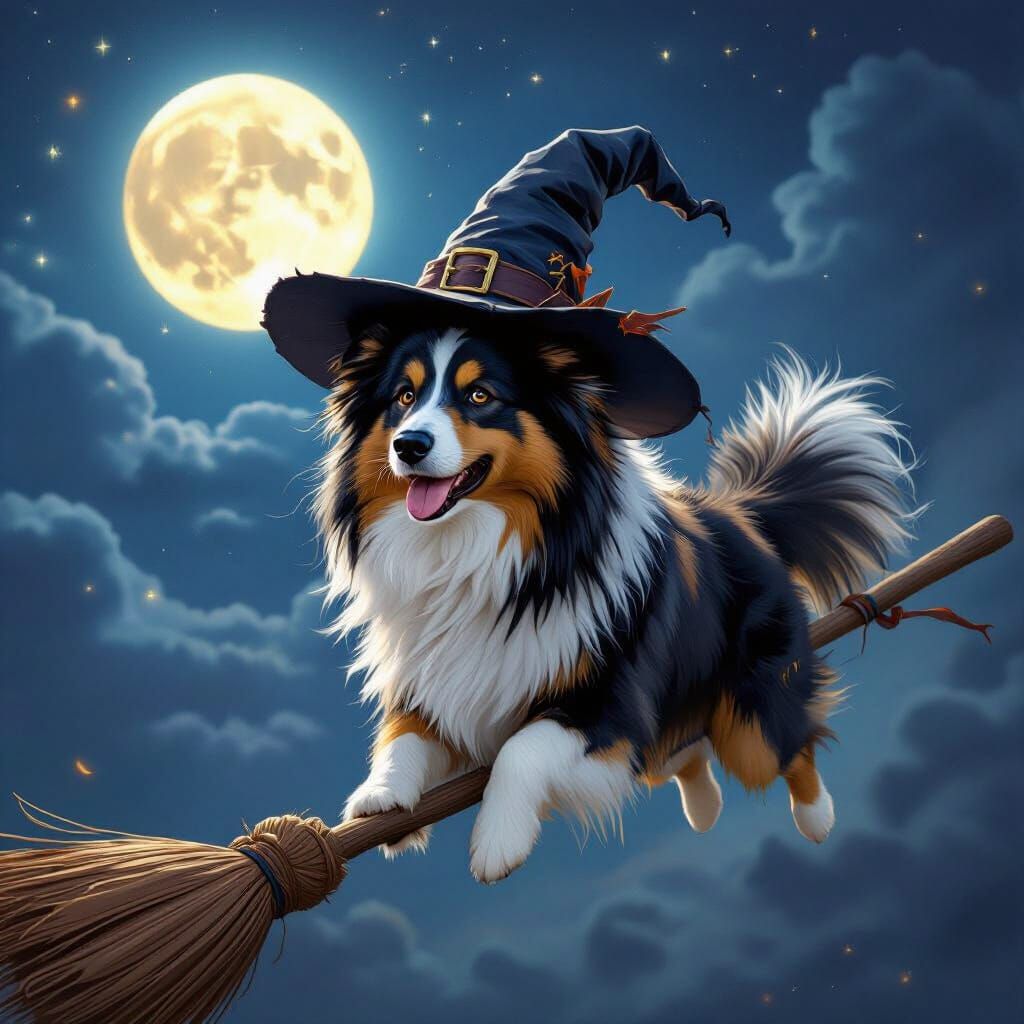 A fluffy, proud rough collie in a witch's hat soars through the night sky on a broomstick. Moonlight illuminates its fur against a starry, cloudy backdrop. This fantasy art features mystical colors and hyperrealistic detail.
