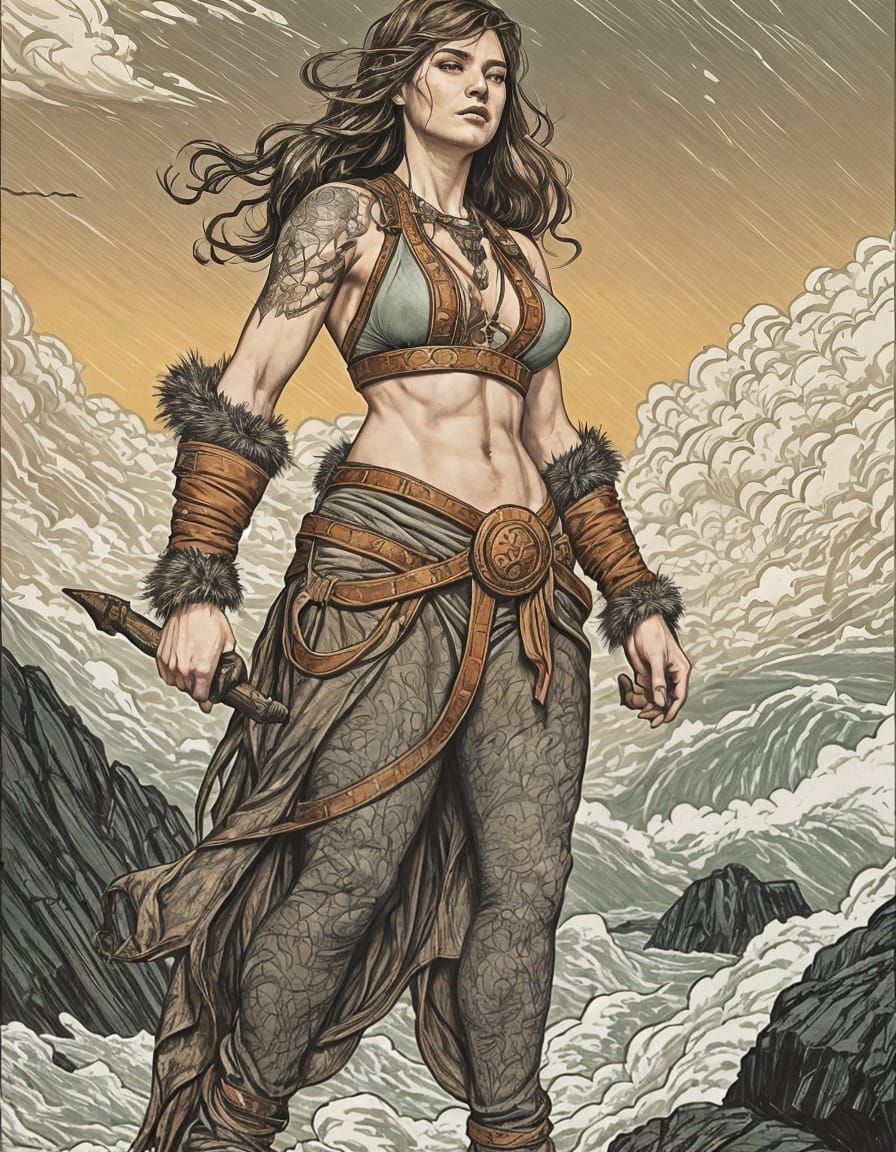 A powerful stone troll stands on a cliff, swinging a boulder. She is composed of stone and earth and wears furs. The image is inspired by folklore with intricate linework and earthy tones.
