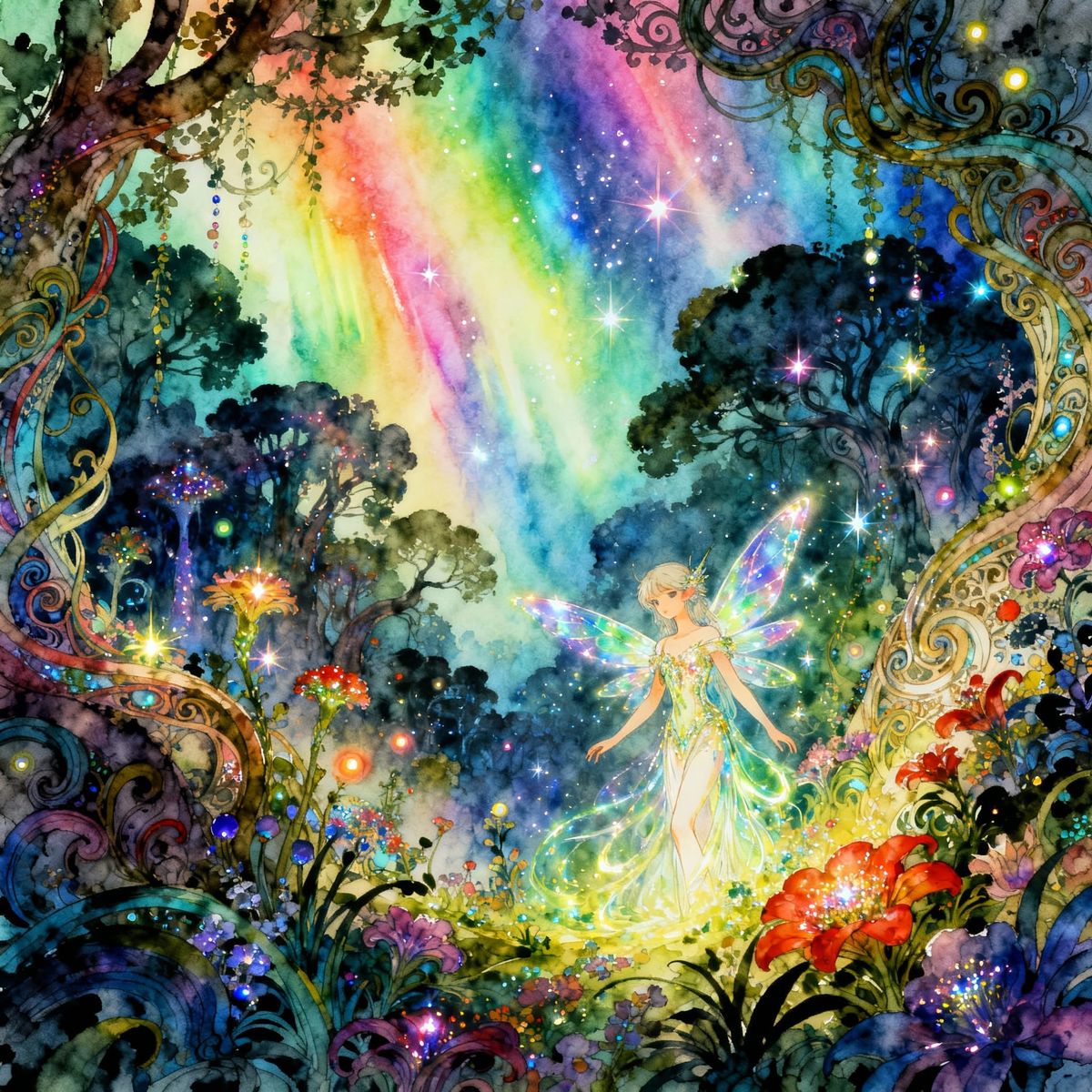 This AI-generated image depicts a whimsical rainbow-colored fantasy scene with a magical aura, sparkling lights, and vibrant, swirling colors in an ethereal atmosphere. Rendered in a detailed watercolor and ink wash style.