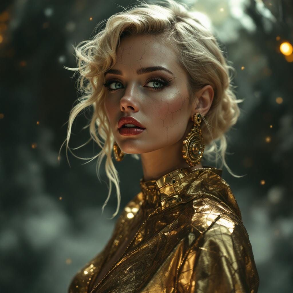A captivating image of a 1950s blonde pin-up woman in a gold leaf dress. The artwork exhibits surreal, photorealistic qualities with symbolic visual metaphors in a steampunk aesthetic.