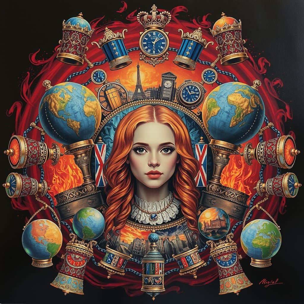 This image depicts historical scenes of London and Paris, including the Great Fire of London. The hyperrealistic style captures the twisting and swirling chaos of these events.