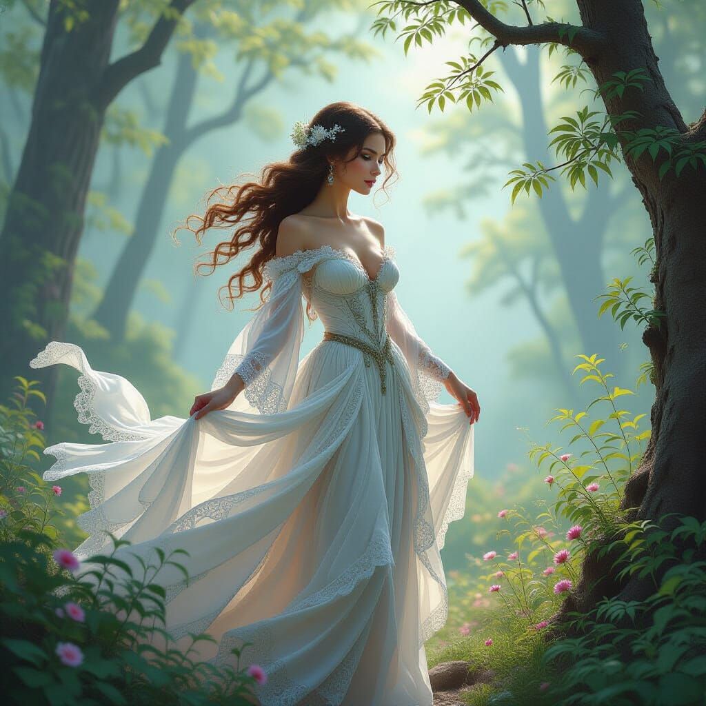 This image shows an ethereal maiden in a whimsical forest. The artwork captures the warm, inviting style of luminism with dreamlike qualities and delicate, lace-like textures.