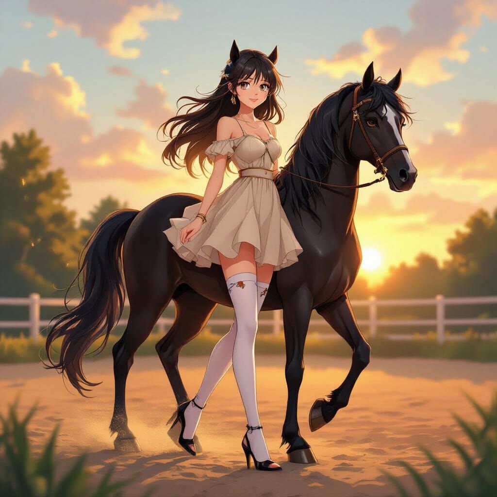 An anime-style image of a magical centaur girl named Lucija smiling at sunset. She wears a summer dress and magical tights, with her horse body in warm golden hour light. Rendered with smooth cel colors.