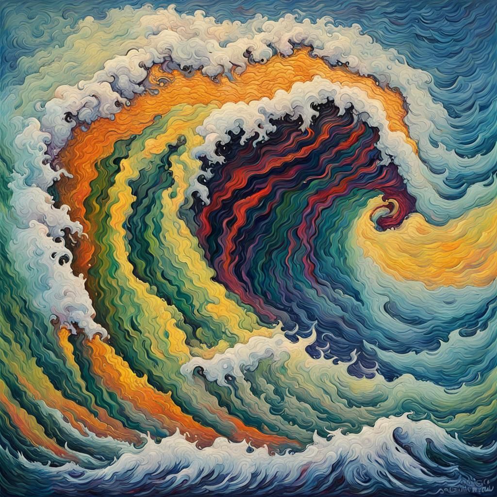 A striking picture of an ocean wave transforming into a monster. This artwork blends abstract splashes of oil and watercolor in an expressionist style with thick, colorful layers.
