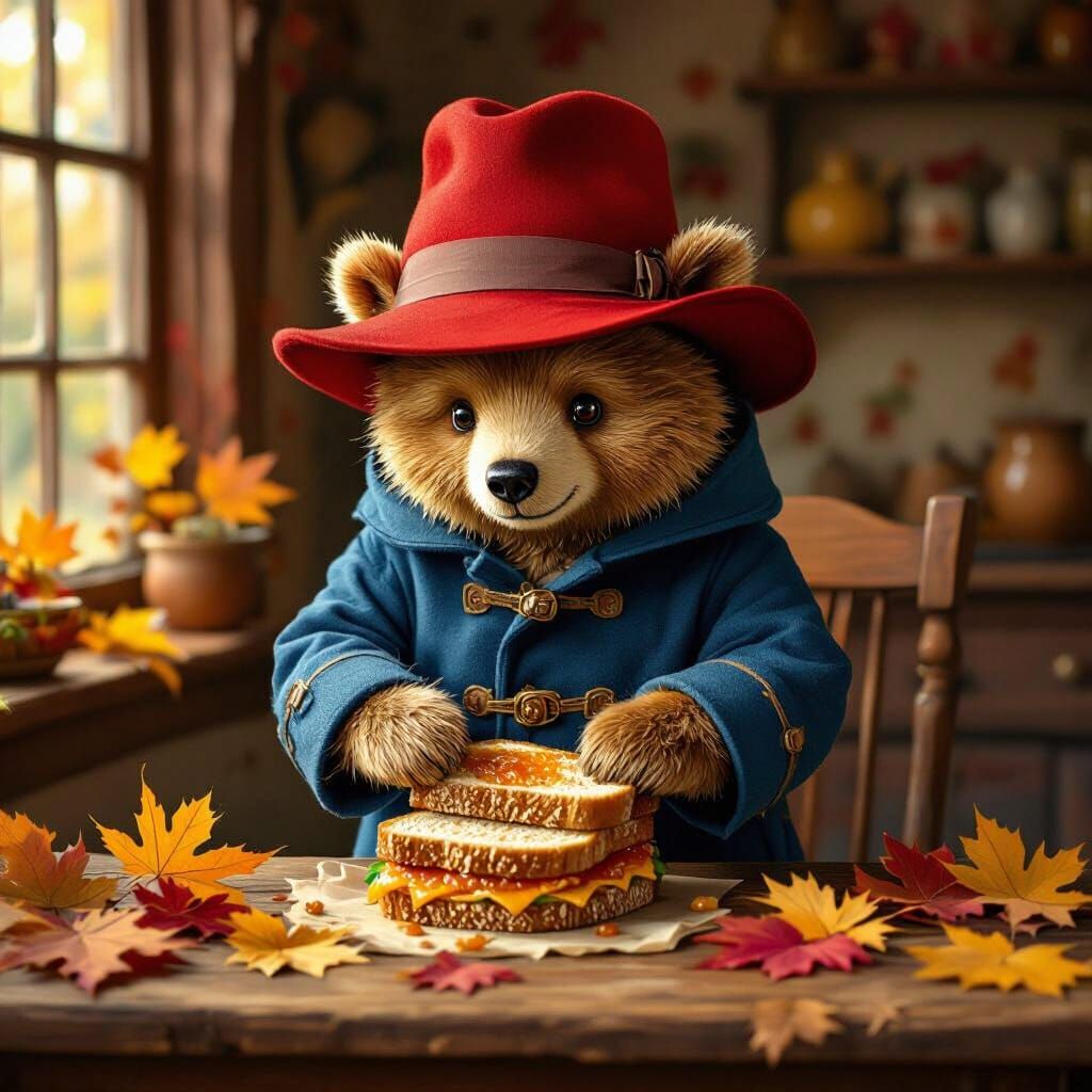 This image shows Paddington Bear making a marmalade sandwich in a cozy autumn kitchen. The illustration style evokes classic children's book art with its intricate details and warm lighting.