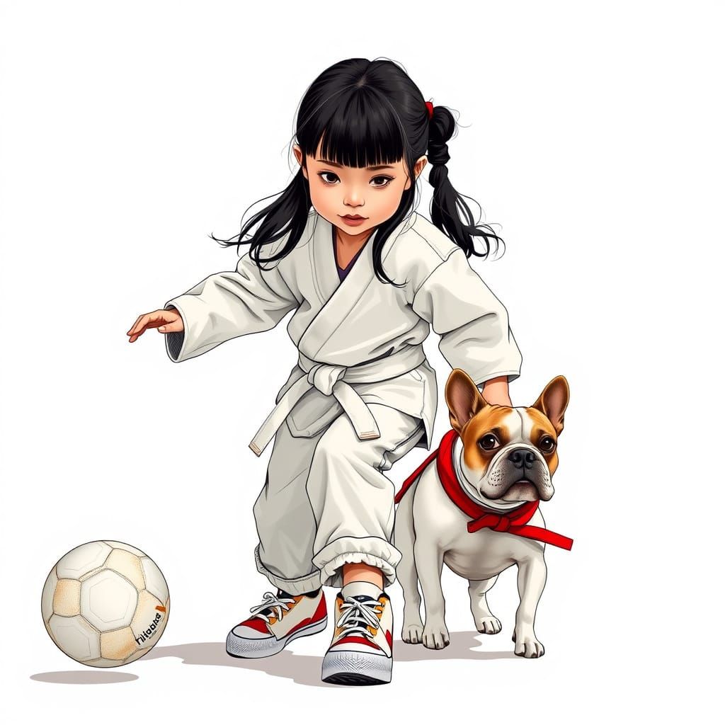 A digital artwork of a serious 6-year-old girl in a white Judo jacket, light jeans, and worn sneakers, performing a Judo kick next to her Boston bulldog in a stark, isolated style.