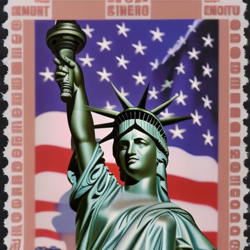 A photorealistic image of a 1955 commemorative postage stamp. The stamp features the Statue of Liberty against an American flag backdrop, rendered with natural light and patriotic colors as 3D digital art.