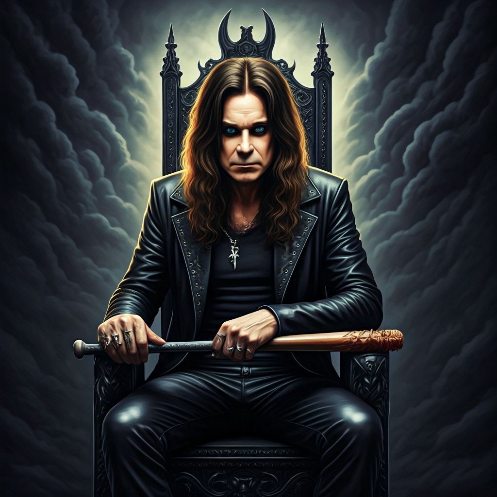 This image shows Ozzy on a dark throne, confidently holding a bat against a backdrop of ominous black clouds. The scene features dramatic lighting and intense shading, in a style reminiscent of dark fantasy art.