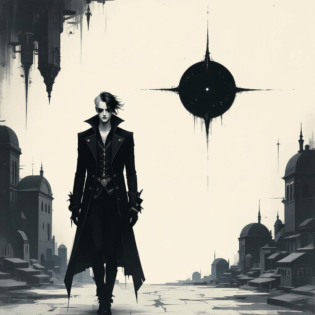 A striking picture of a tall, mysterious man with heterochromatic eyes. He wears layered, dark clothing and glowing jewelry in a neo-gothic, celestial style. The image evokes a haunting, digital art aesthetic.