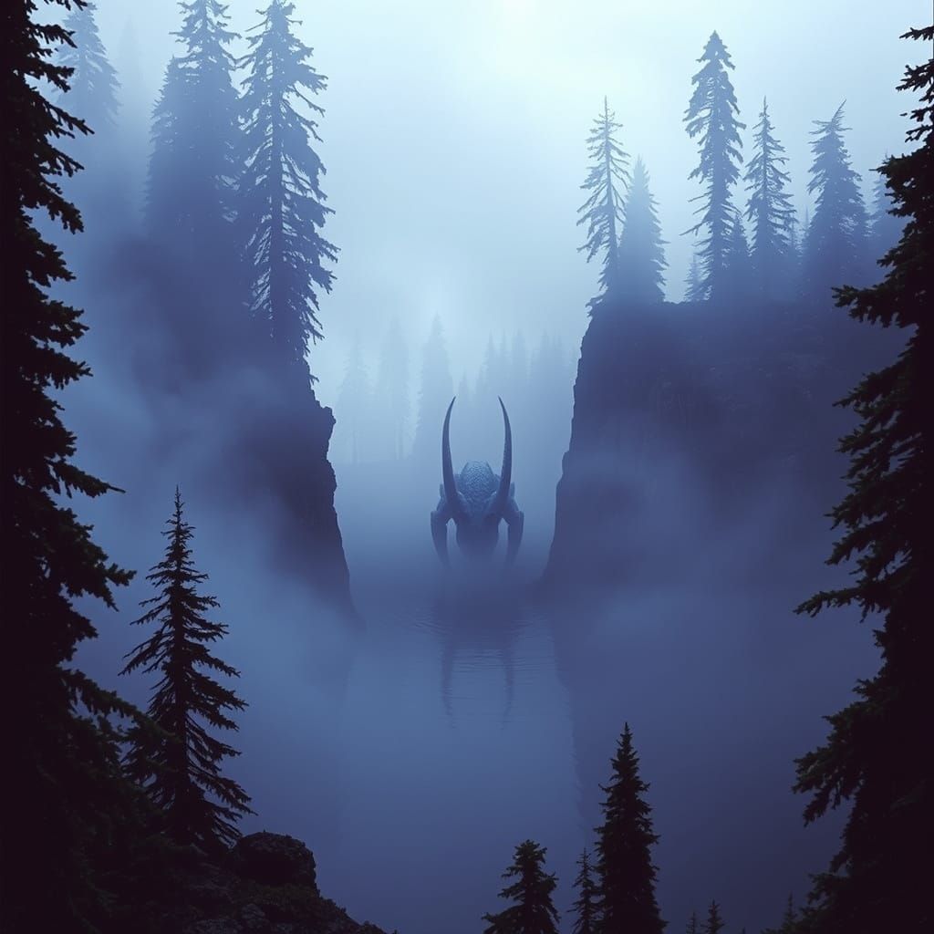 A surreal creature rises from a misty lake surrounded by evergreen trees. The image evokes a dark, eerie, mystical atmosphere in a biomechanical surrealist style.