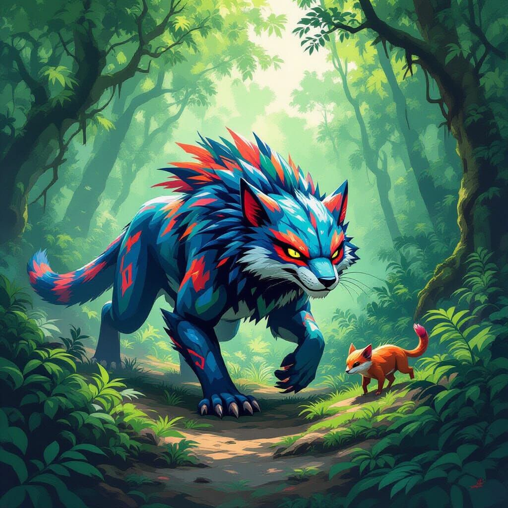A striking image of a colorful predator hunting in a vibrant, green forest. The artwork features intricate textures and dynamic brushstrokes, evoking a sense of movement and life.