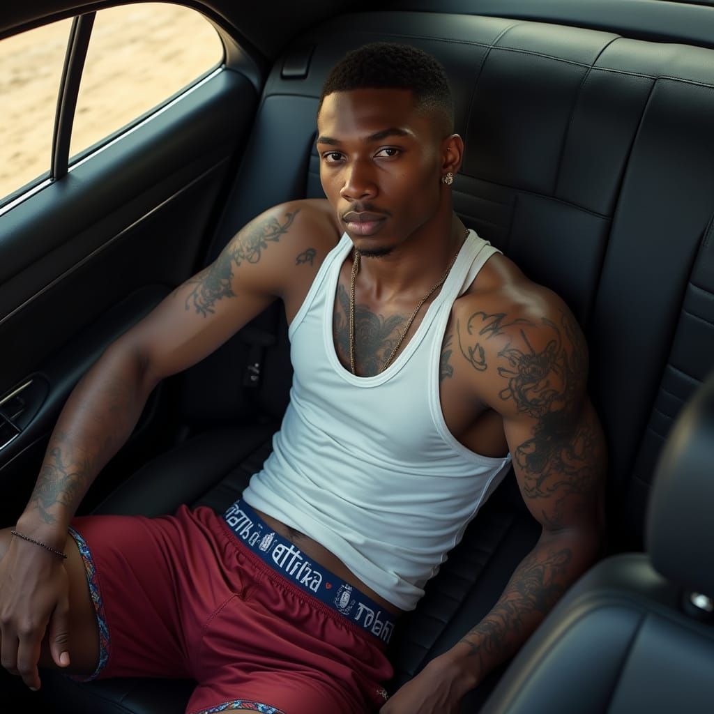 This image shows a young man sitting in a car. The man has tattoos and is wearing casual clothing. The image is styled with bold lighting and shadowed details, in a contemporary realism style.