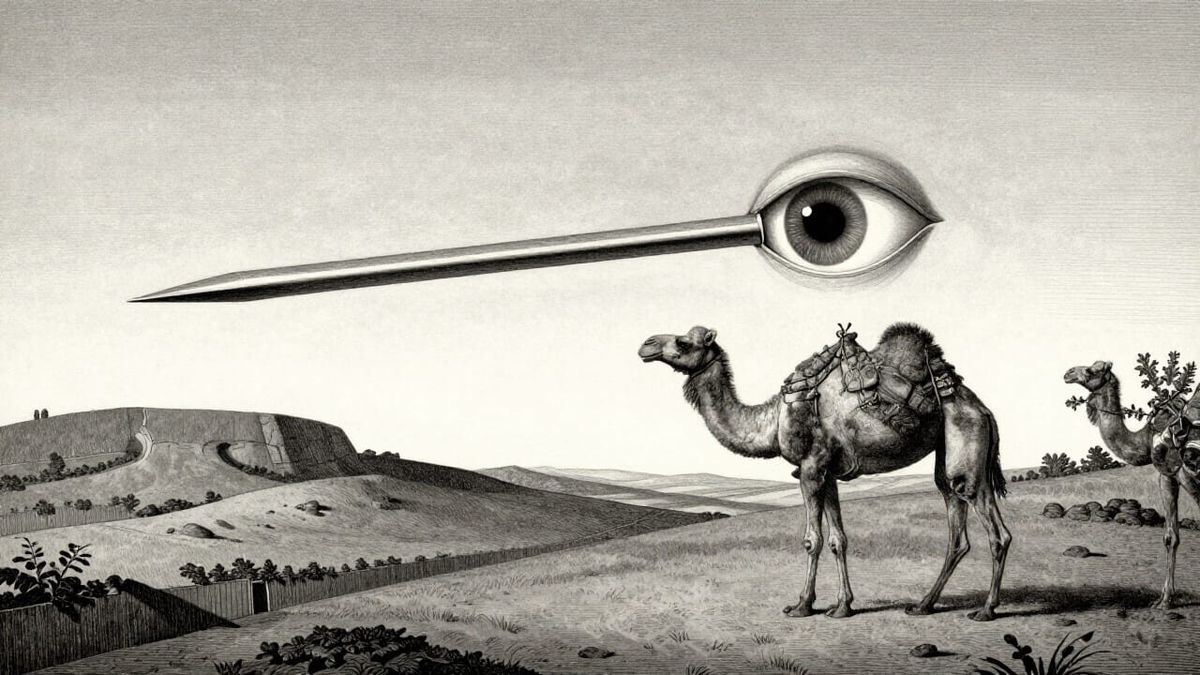 This image depicts an impossible feat: a camel squeezing through a tiny needle's eye in a surreal Belgian setting. It's rendered in the distinctive ligne claire style, reminiscent of surrealist art.