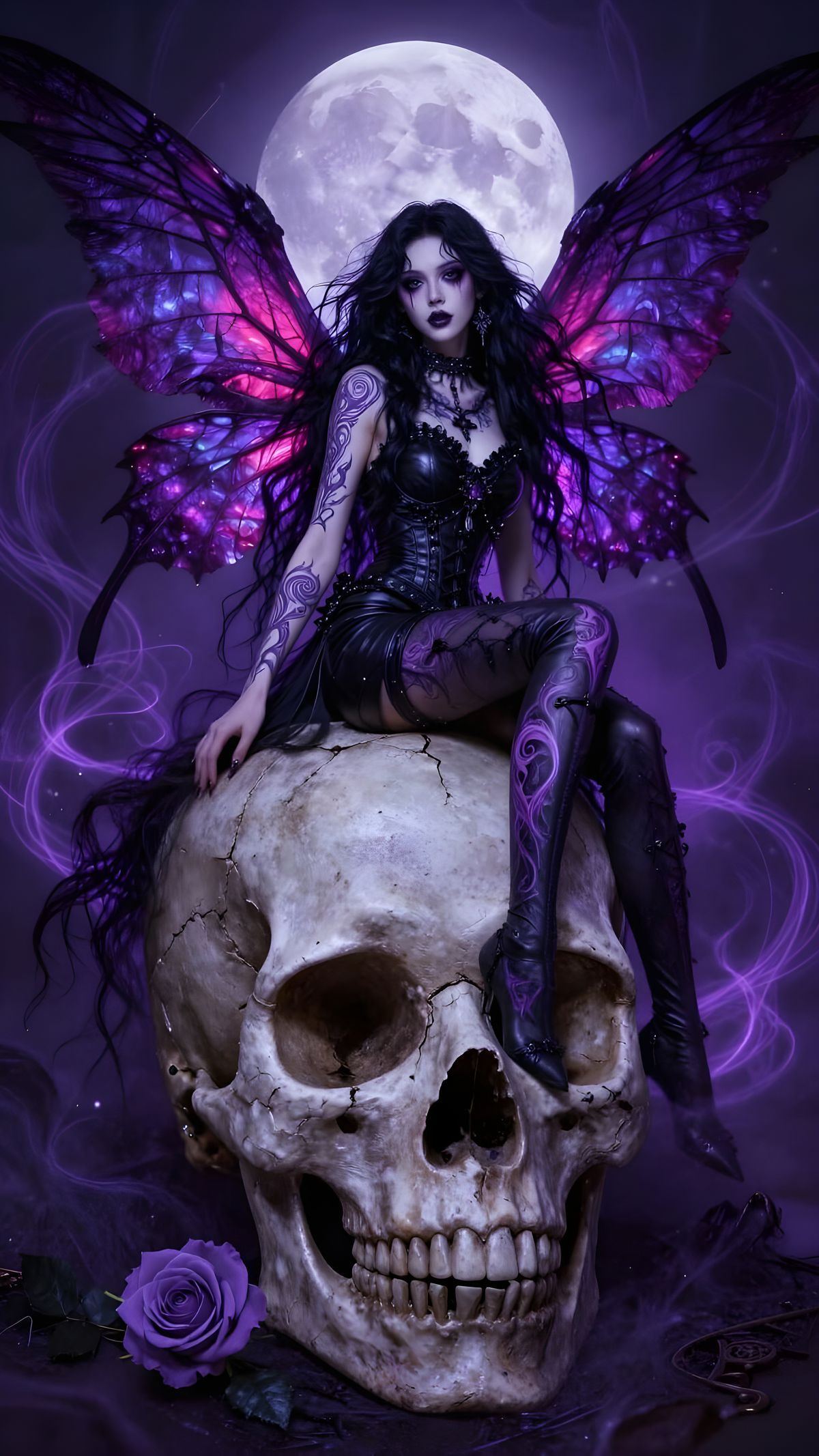 A gothic fairy with veined wings sits on a giant skull, adorned with tattoos and a glowing rose. Ethereal dark fantasy art with vibrant purples and moonlit silver.
