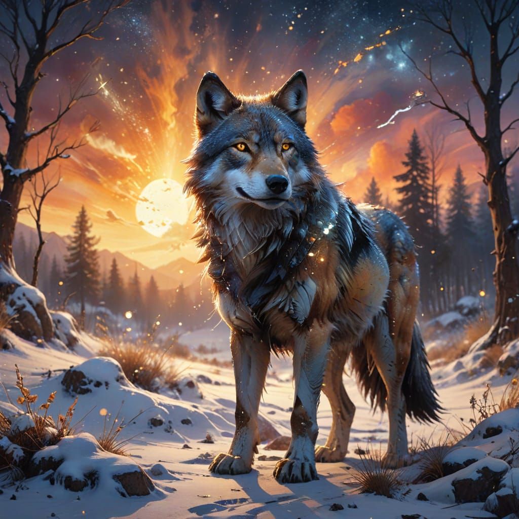 A dreamy watercolor painting of a wolf beneath a starry winter sky at sunset. Golden light and soft brushstrokes create a cinematic, ethereal scene. Inspired by watercolor techniques.