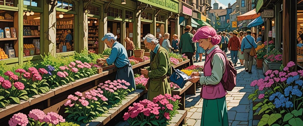 A vibrant comic book style image of a fresh market scene. People are shopping and sitting on benches amidst mossy stone walls, magenta flowers, and bright sunlight, in a watercolor and gouache aesthetic.
