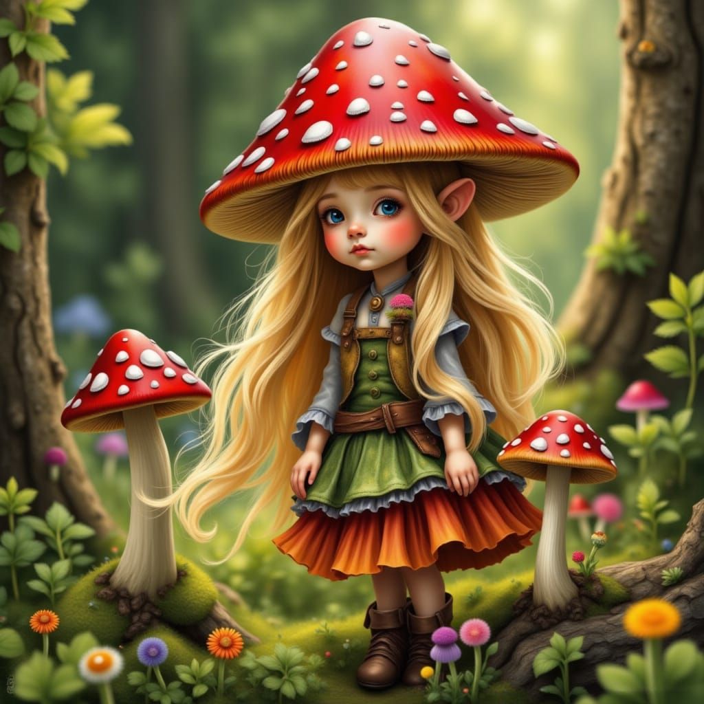 A whimsical image shows a mushroom fairy with long blonde hair, wearing a mushroom hat, as she walks through a colorful forest. The image is highly detailed and realistic.