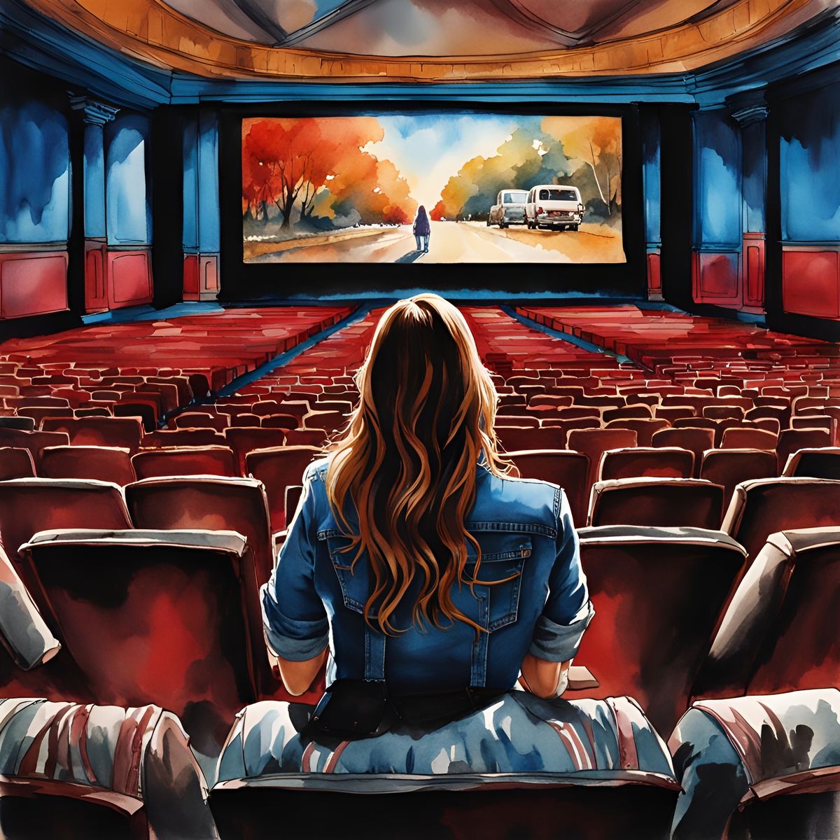 This image shows a woman watching a movie in a theater. The ink and watercolor illustration features a woman sitting in a movie theatre in an aetherpunk aesthetic.