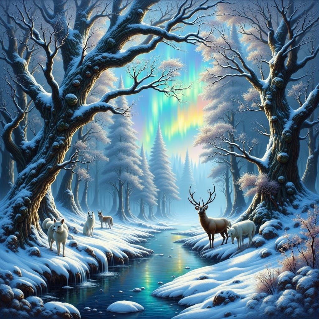 This image showcases a phantasmagoric snowy forest with fantastic trees, luminous fruit, and magical mist. Winter light creates halos and rainbows, with majestic wildlife and northern lights in the sky.