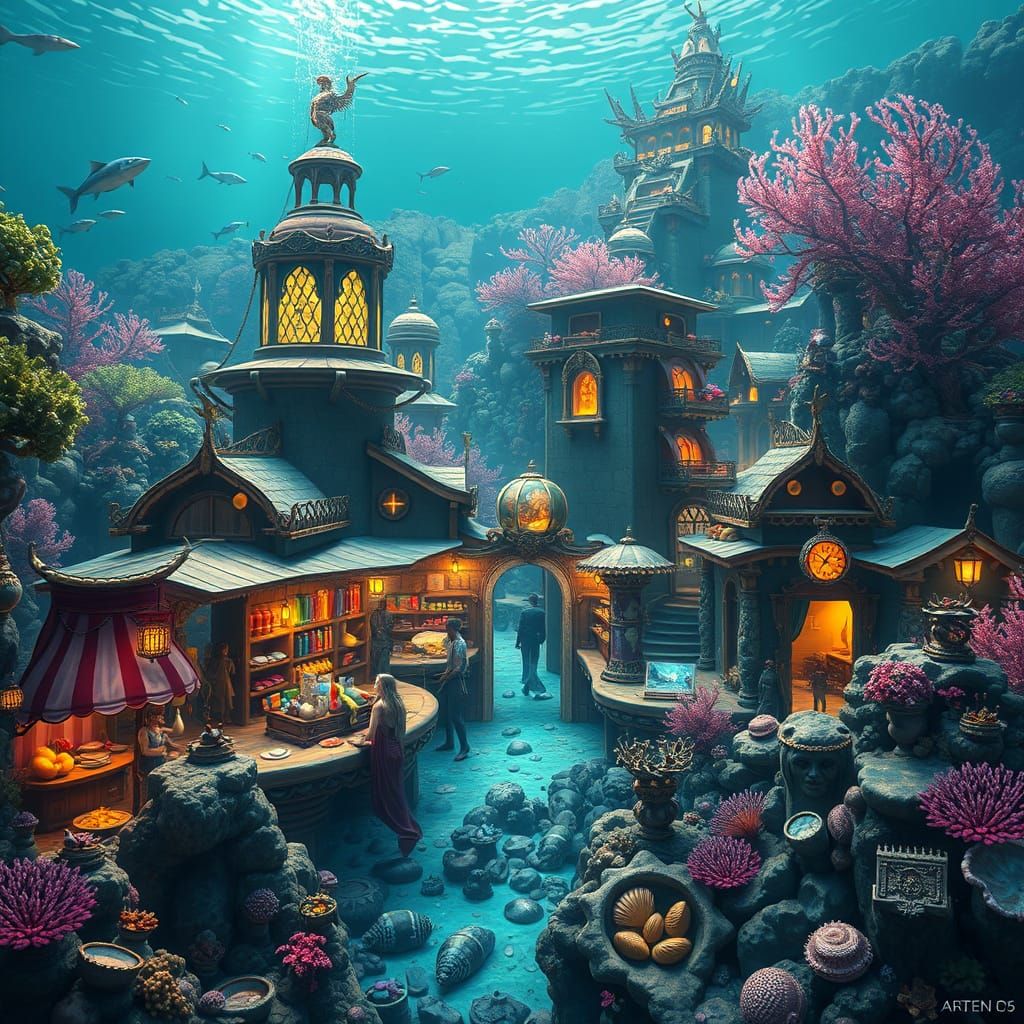 This image shows a busy underwater marketplace in a coral reef city. Humans and merfolk trade goods among buildings made of shimmering pearls and shells, as 8k resolution fantasy concept art.
