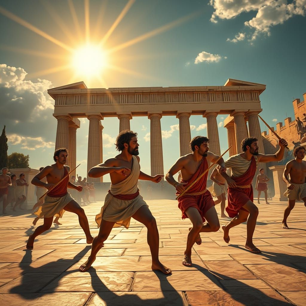 This image depicts a scene from ancient Greece, showcasing athletes in the Olympic Games, set against a sun-kissed Greek temple with intricate marble details and warm golden tones, blending historical accuracy with photorealistic precision
