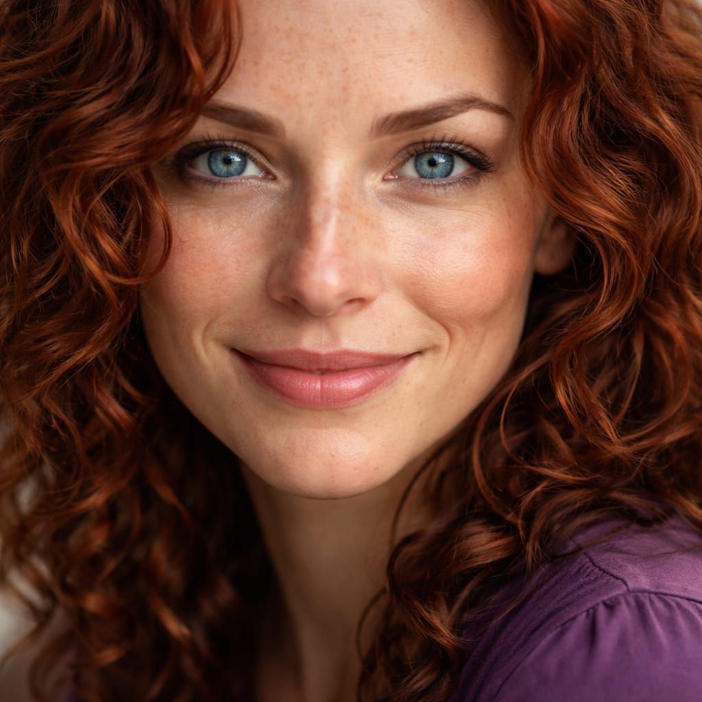 This highly detailed digital artwork features a close-up portrait of a smiling woman. She has striking blue eyes, freckles, and dark red curly hair, wearing a purple blouse.