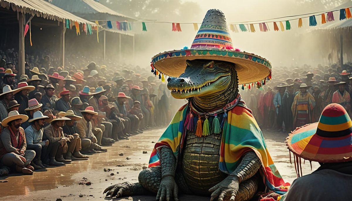 This image shows a cheerful anthropomorphic crocodile in traditional Mexican attire, enjoying a Lucha Libre wrestling match. It's rendered in a loose watercolor style with sunrays.
