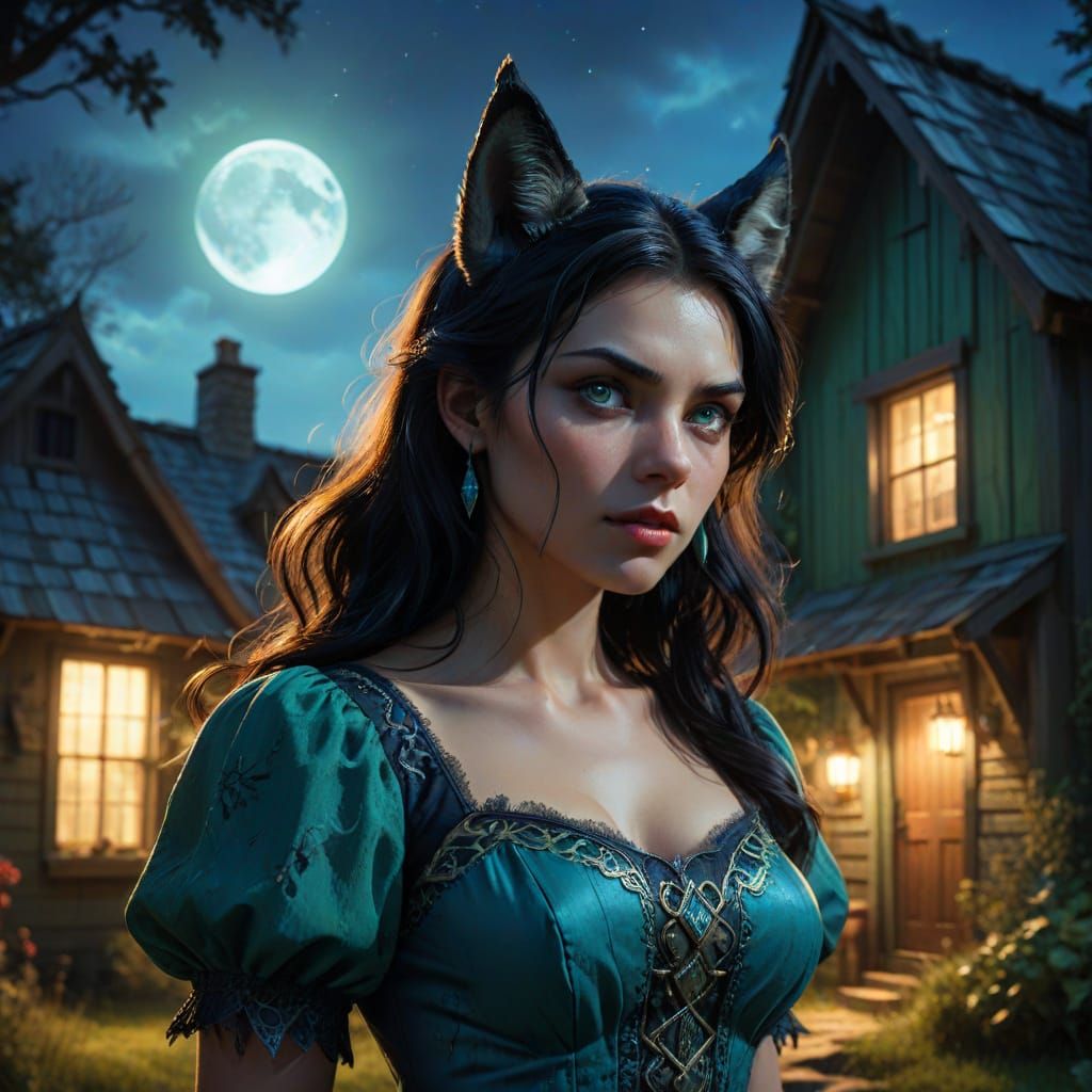This image shows a black-haired, green-eyed female lycan with wolf ears standing near a cottage in the moonlight. The style is reminiscent of comic book art with vibrant colors and dynamic shadows.