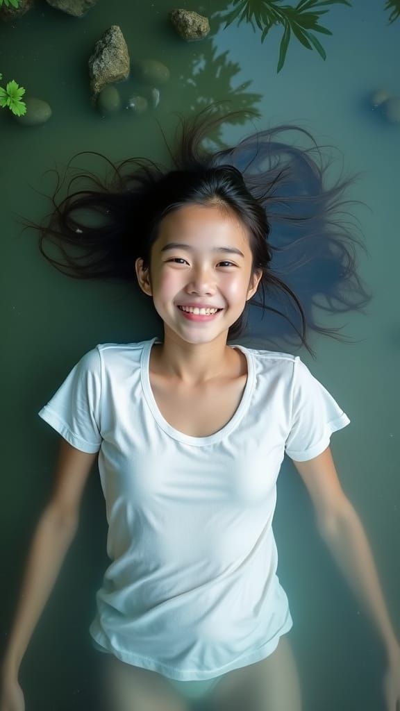 A serene scene of a young Taiwanese girl relaxing on a lake's edge, her white t-shirt wet, with a gentle smile, surrounded by clear water, stones, and fish