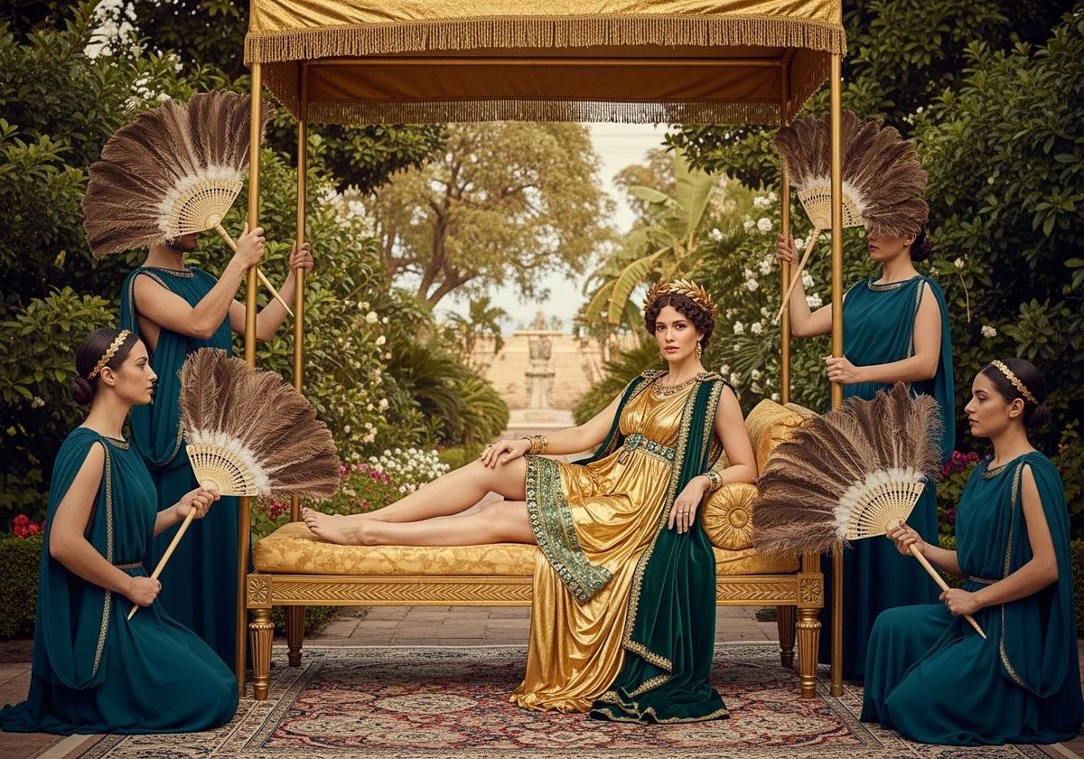 This image shows Empress Messalina in a gold and emerald toga, reclining on a divan within lush gardens. Servants attend to her with fans and a canopy, captured in a sharp focus with natural lighting. The aesthetic is reminiscent of professional photography.