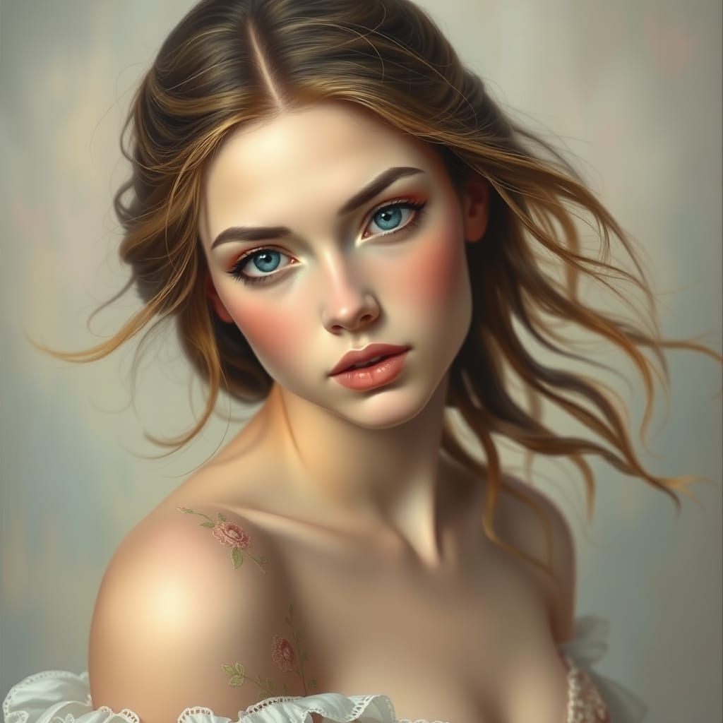 A breathtakingly lovely portrait of a young woman bathed in soft golden light, her eyes radiant with warmth and kindness, delicate features framed by flowing hair that glimmers like silk, wearing an elegant gown with subtle floral embroidery. The background is softly blurred with pastel tones, evoking timeless beauty. Ultra-detailed, painterly realism with a touch of ethereal glow, reminiscent of a masterpiece that belongs in an art museum — the kind of portrait that captures the soul and will be remembered forever.