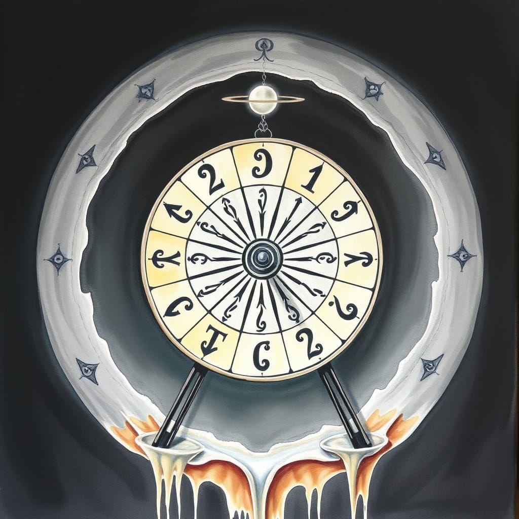 This image shows a surreal tarot card depicting the Wheel of Fortune. Rendered in a low contrast, monochromatic pastel watercolor style reminiscent of melting oil on canvas.