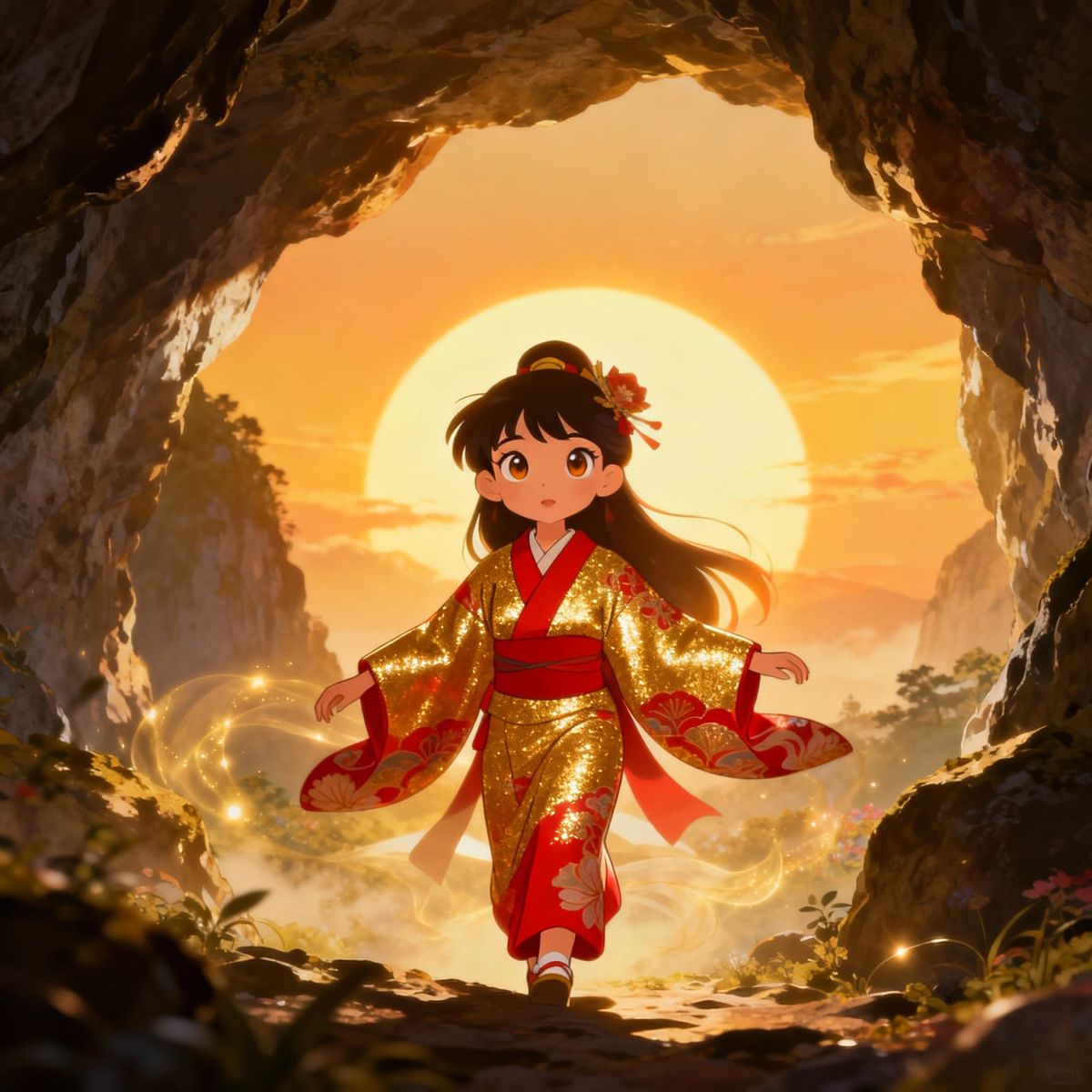 This image depicts Amaterasu, the sun goddess, in a classic animation style. She emerges from her cave in a shimmering kimono, bringing dawn's golden light to the world.