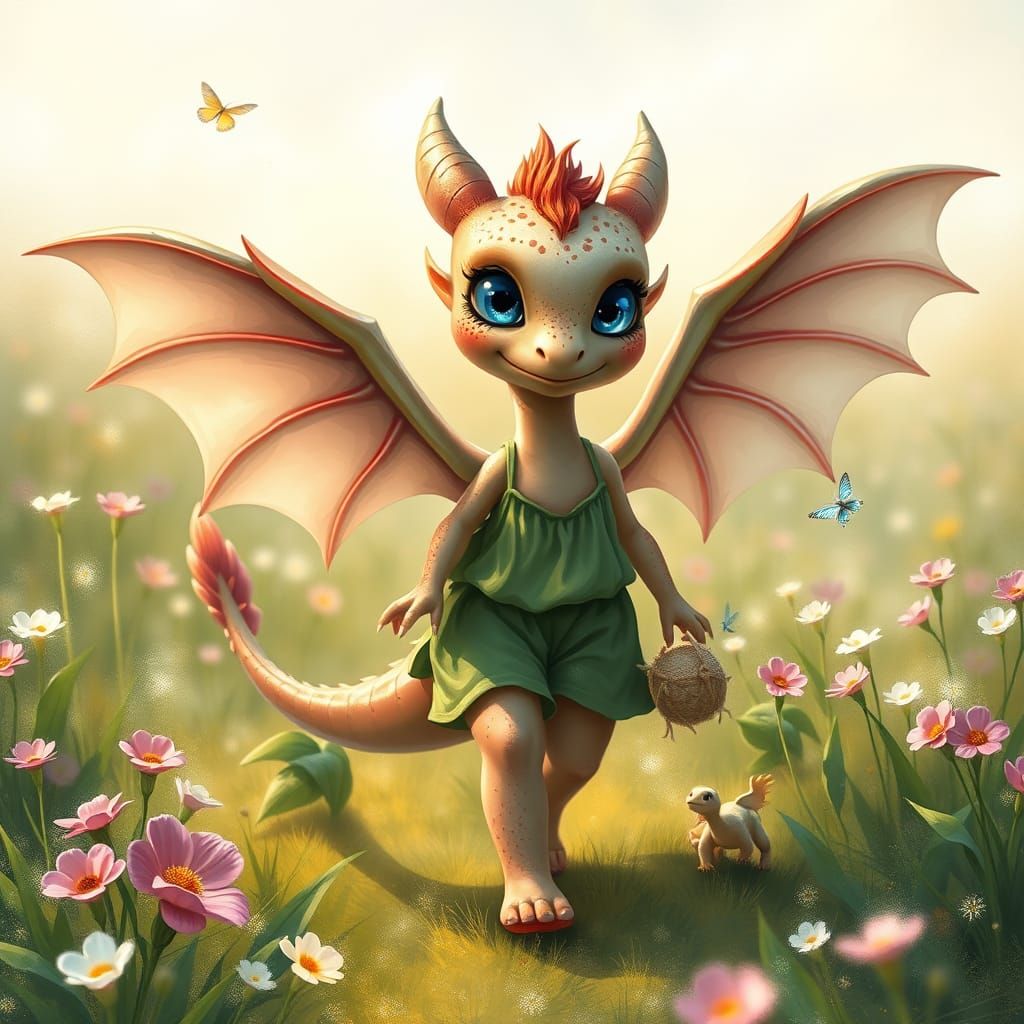 A serene, magical scene of a teenage dragon strolling through a lush meadow, surrounded by vibrant flowers and an ethereal mist, as a baby dragon wobbles by its side. This whimsical, hyper-realistic artwork captures a moment of wonder and joy in a dreamy, idyllic landscape, inspired by the Fauvists and m...