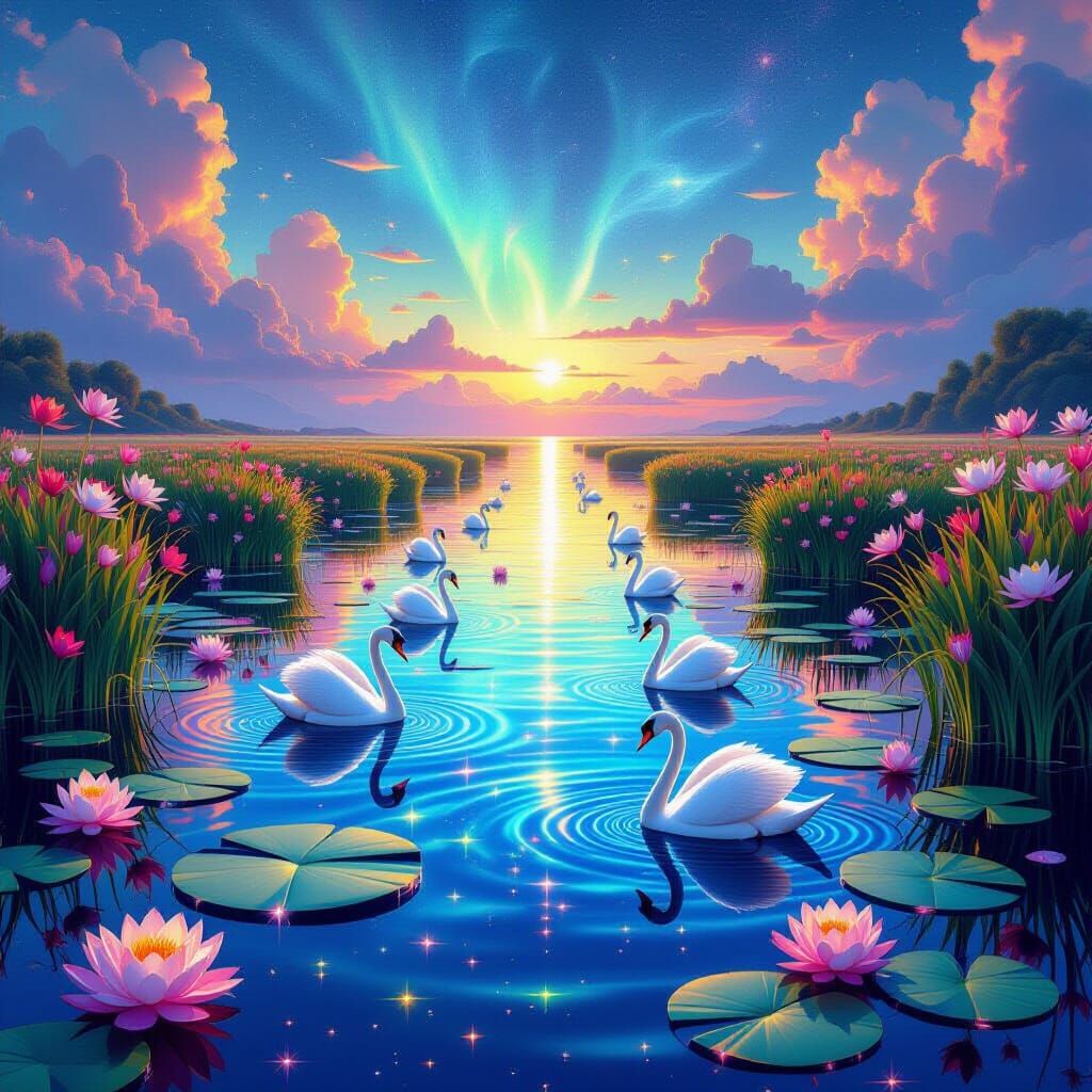 A fantasy lagoon with geometric lily pads and fractal reeds, featuring radiant swans and mythical creatures. Surreal ripples and glowing mist create vivid depth in neon-gradient waters under a cosmic sky.