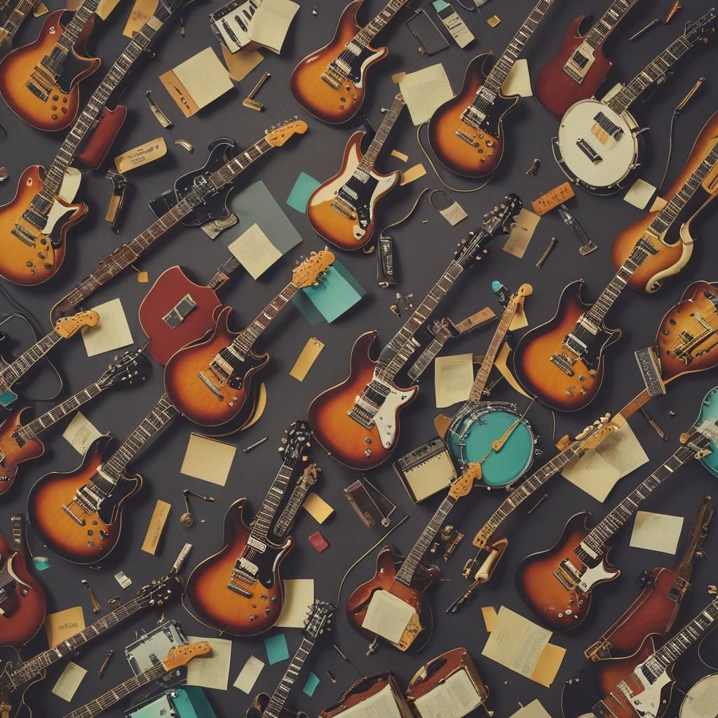 This image showcases a flat background filled with colorful musical notes, guitars, saxophones, and drums. The still has cinematic lighting and a film grain effect.