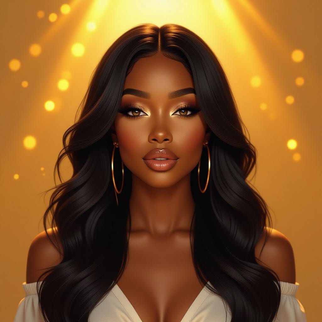 This image shows a determined Black woman with long, silky hair in a warm, golden recording studio. Sun rays highlight her melanin, symbolizing hope and emotional transformation.