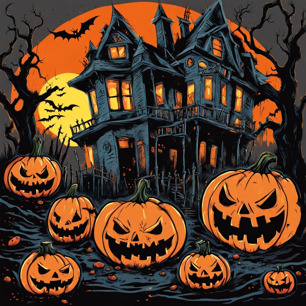 This image depicts a terrifying Halloween street art scene with skeletal figures, a haunted house, and menacing pumpkins. It features a dark, intense color palette with energetic lines and abstract symbols.