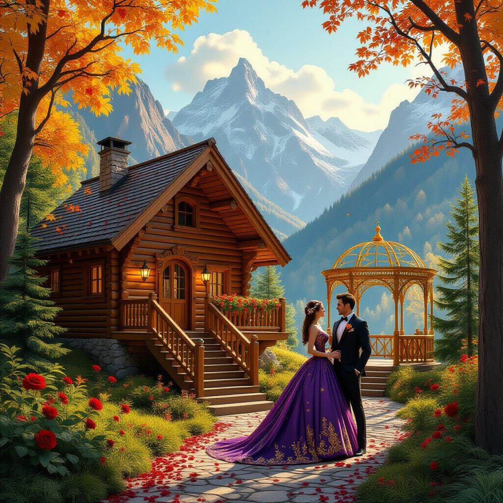 This image depicts a captivating wood cabin surrounded by vibrant shavings mountains and trees. A couple in formal attire poses near a gazebo amidst falling leaves and glitter dust. Cinematic lighting enhances the detailed scene.