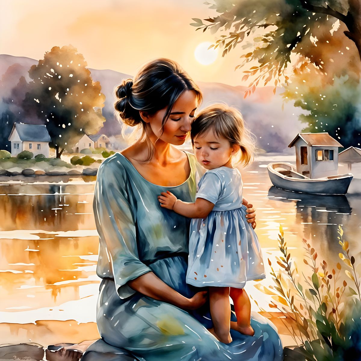This image shows a tender moment between a mother and child, set in a peaceful atmosphere, with a focus on warm and intimate emotions.