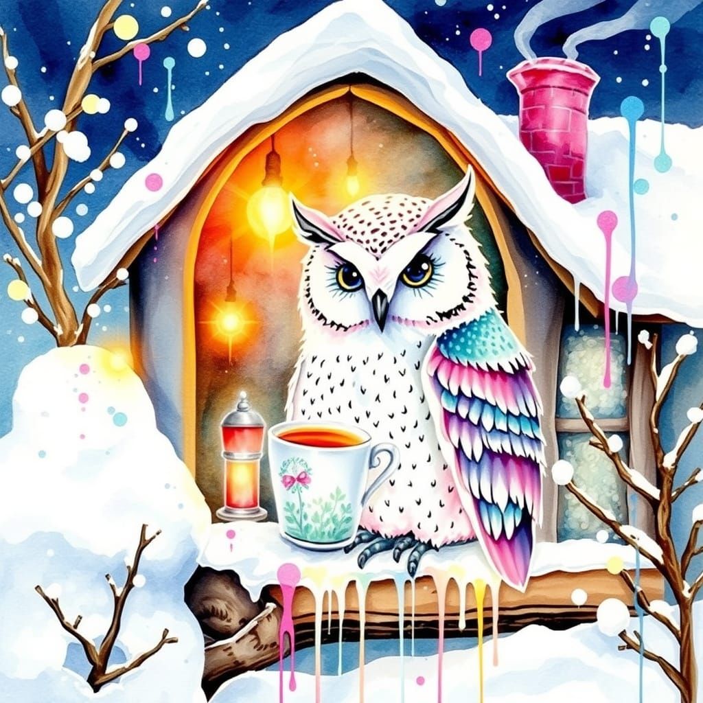 A watercolor painting of an owl drinking tea inside a cottage in winter. The artwork uses soft pastel colors and splash art techniques to create a cozy, enchanting mood.