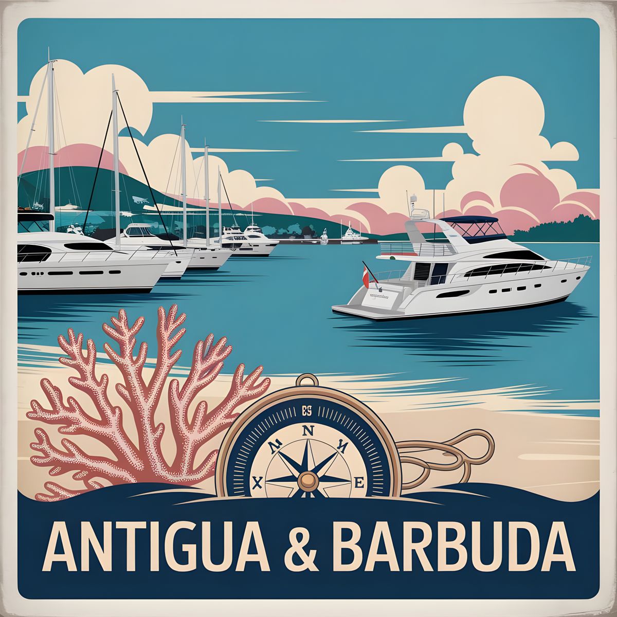 A breezy, elegant travel poster capturing the maritime charm of Antigua & Barbuda. Yachts rest in English Harbour, with Nelson’s Dockyard gracing the shoreline. Soft coral beaches shimmer beneath a pastel Caribbean sky. In the foreground, a sea fan coral and a classic compass add a touch of oceanic grace.