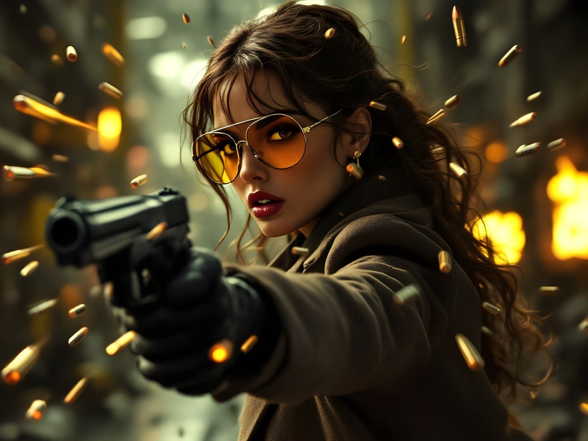 This image shows a striking scene of a secret agent, inspired by classic spy films, dodging bullets in a gritty industrial setting. The agent's style is reminiscent of 1960s spy fiction, with a nod to the era's iconic fashion.
