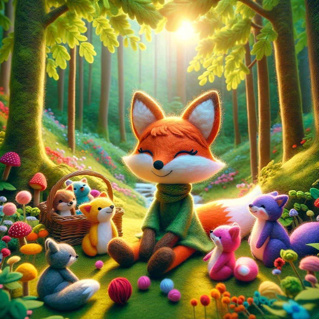This image shows a charming scene of a felted fox with her felted animal friends in a vibrant meadow within a lush forest. The image radiates warmth and comfort with vivid colors creating a cozy, kid-friendly atmosphere.