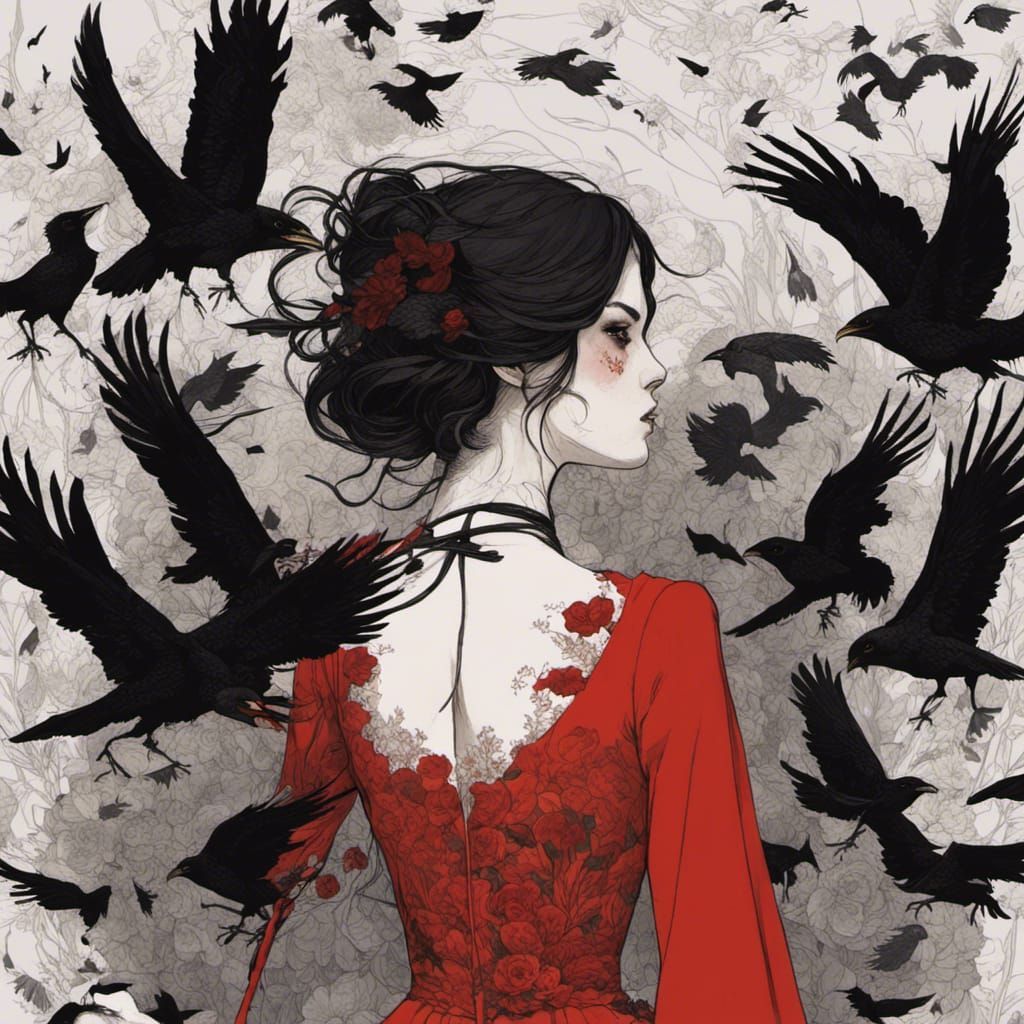 A striking picture of a girl in a raven-feathered red dress. The image features highly detailed and vivid textures, with a cinematic quality and a side profile view, in a dark fantasy aesthetic.
