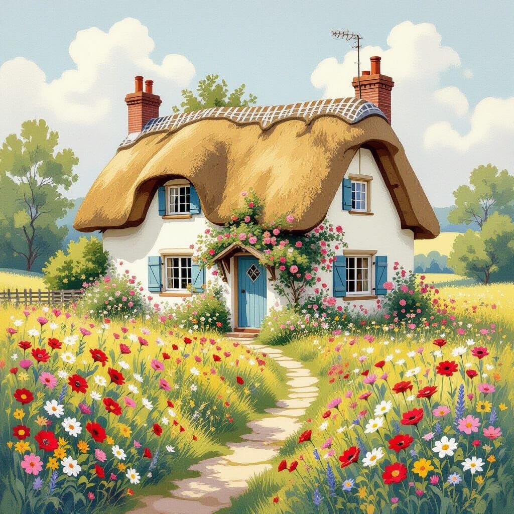 A charming cottage with roses and a thatched roof sits in a wildflower meadow. The image is reminiscent of vintage storybook art with soft pastel colors and delicate lines.
